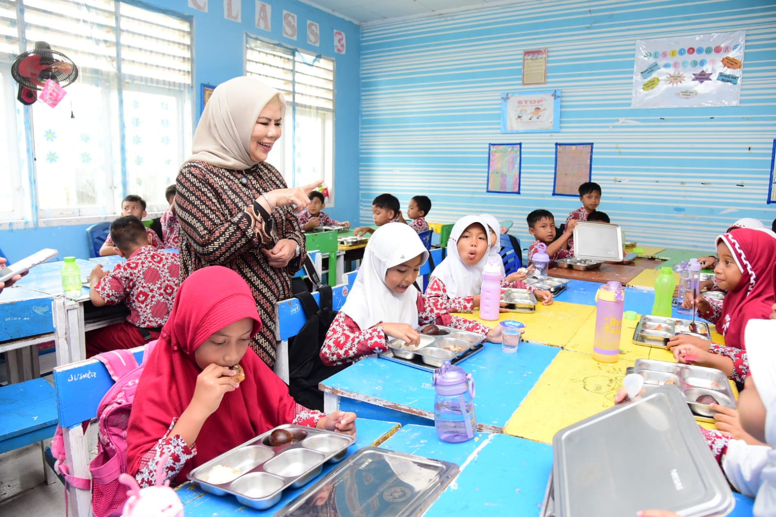 Idah juga mengingatkan pentingnya kebiasaan mencuci tangan sebelum makan. Tak lupa Idah juga mencicipi langsung menu MBG sebelum dibagikan ke siswa-siswi.
