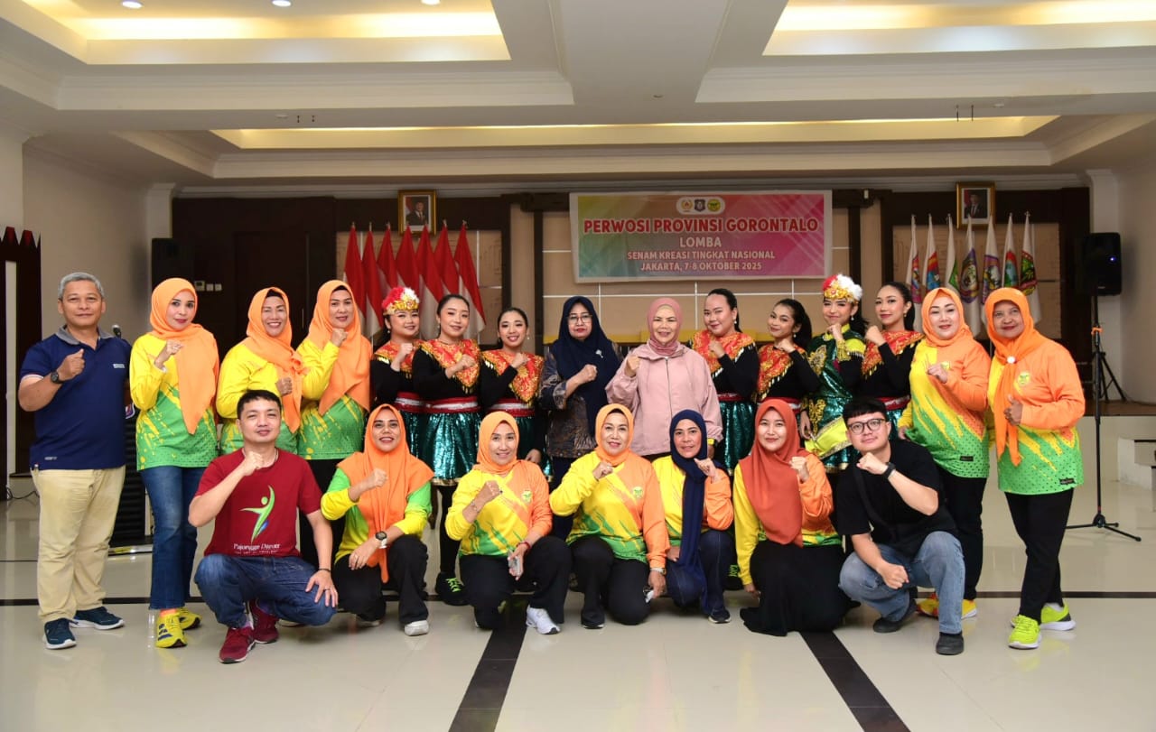 Kota Gorontalo, Kominfotik – Tim Senam Kreasi Persatuan Wanita Olahraga Seluruh Indonesia (Perwosi) Provinsi Gorontalo siap berlaga di ajang nasional memperebutkan Piala Menteri Dalam Negeri (Mendagri). Pelepasan kontingen ini berlangsung di Aula Rumah Dinas Gubernur, Jumat (3/10/2025), oleh Wakil Gubernur Gorontalo Idah Syahidah Rusli Habibie didampingi Ketua TP-PKK Provinsi Gorontalo Nani Ismail Mokodongan.