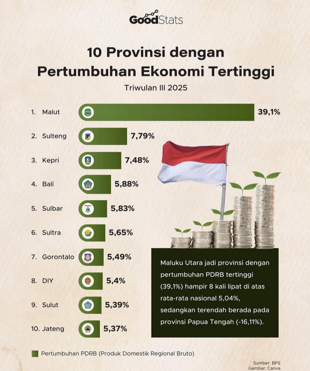 Berdasarkan data Badan Pusat Statistik (BPS) yang dilansir dari goodstats, capaian tersebut menempatkan Provinsi Gorontalo di peringkat ke-7 dalam daftar 10 provinsi dengan pertumbuhan ekonomi tertinggi secara nasional. Dalam daftar tersebut, Maluku Utara berada di posisi puncak dengan pertumbuhan mencapai 39,1 persen, disusul Sulawesi Tengah sebesar 7,79 persen, dan Kepulauan Riau sebesar 7,48 persen.