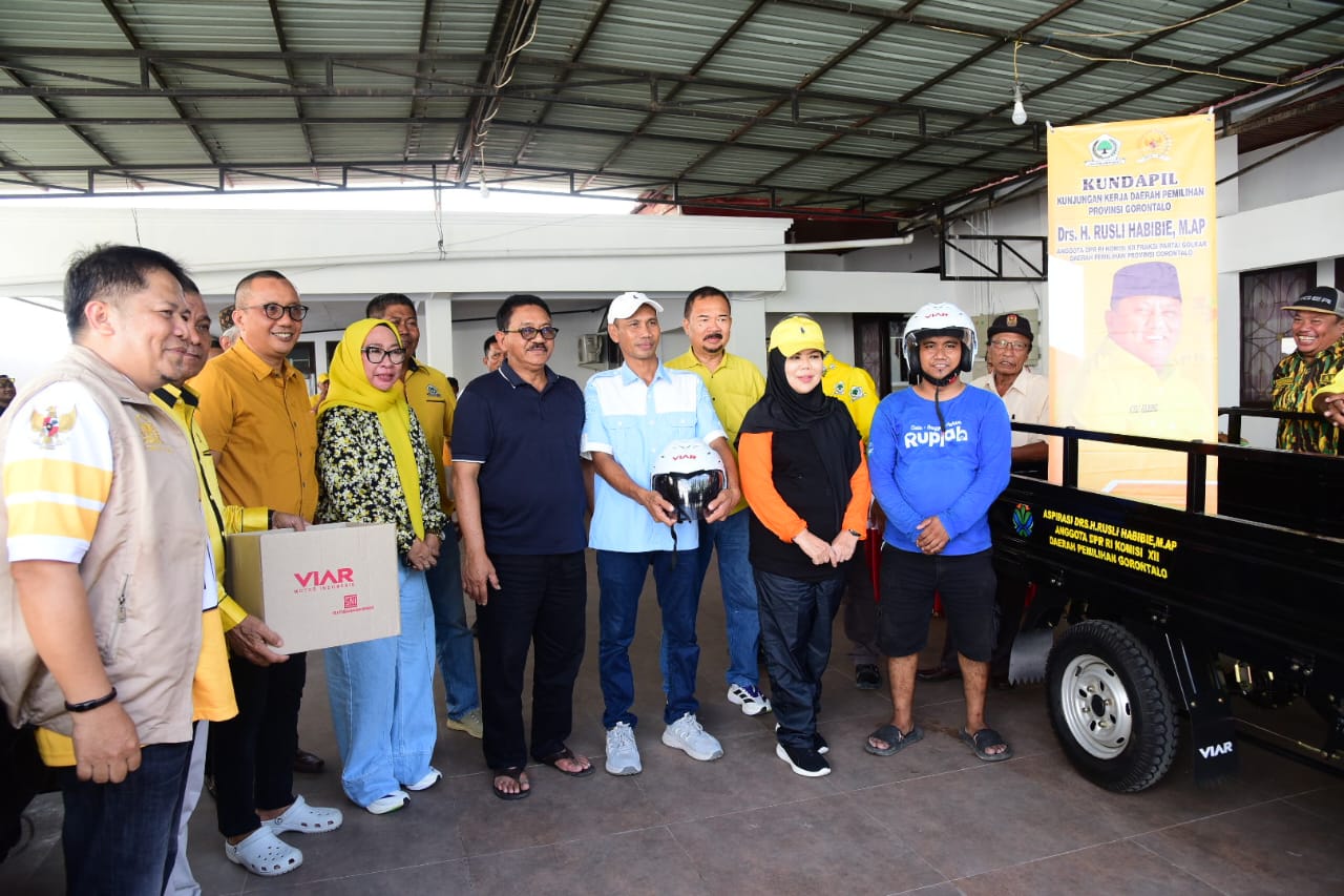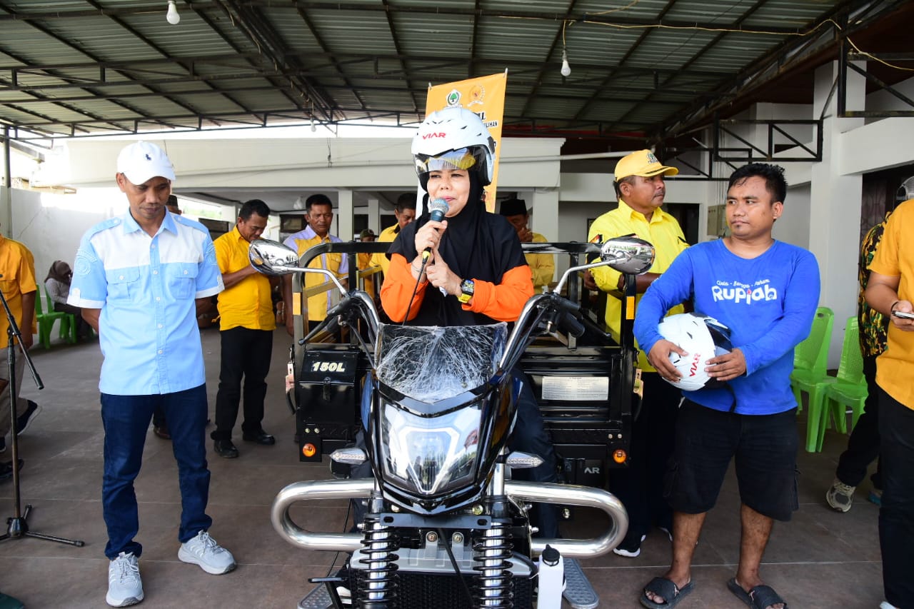 Boalemo, Kominfotik – Wakil Gubernur Gorontalo Idah Syahidah Rusli Habibie menyerahkan bantuan aspirasi Anggota DPR RI Komisi IX Rusli Habibie berupa dua unit motor Viar roda tiga untuk kelompok pengelola sampah di Kabupaten Boalemo.