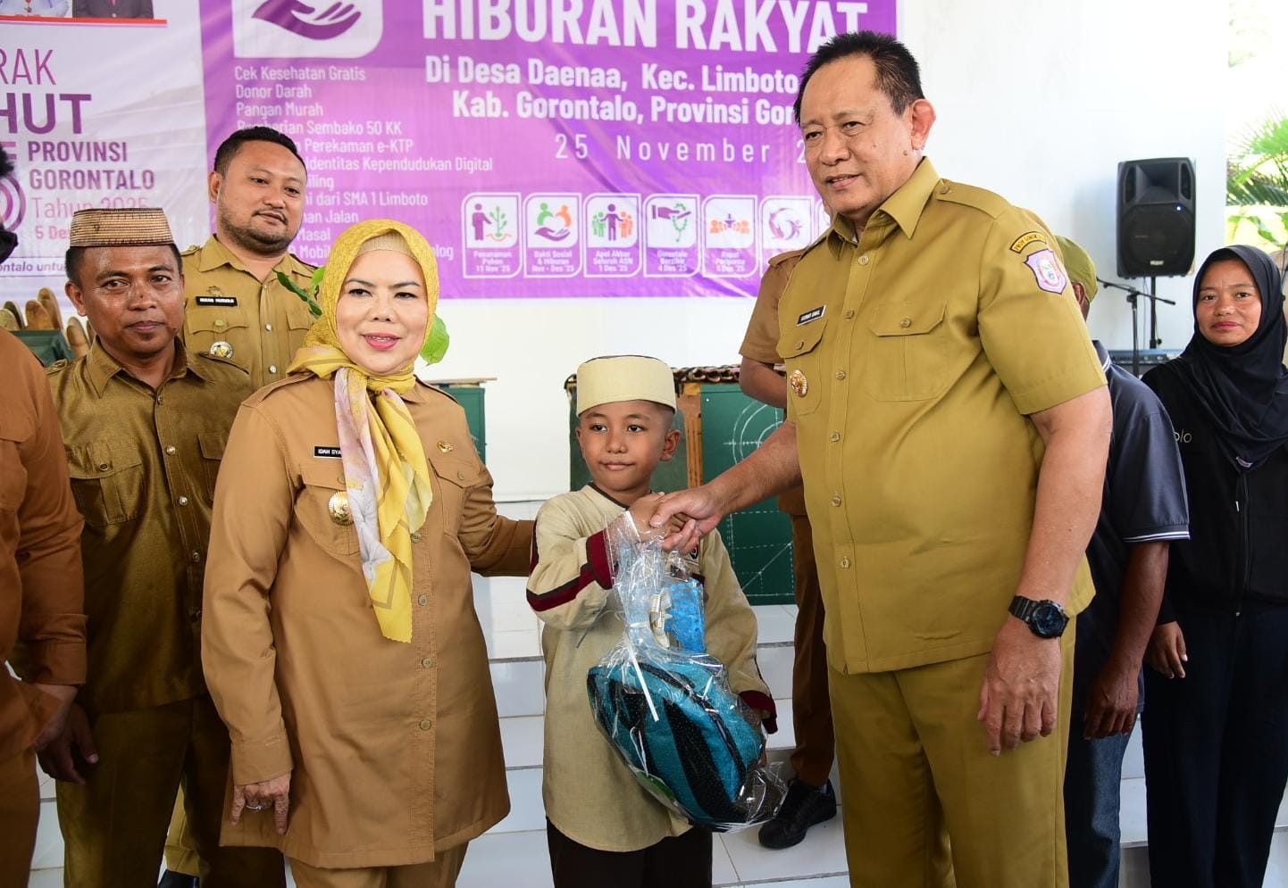 Kabupaten Gorontalo, Kominfotik — Pemerintah Provinsi Gorontalo resmi memulai rangkaian peringatan Hari Ulang Tahun (HUT) ke-25 Provinsi Gorontalo dengan menggelar Bakti Sosial dan Hiburan Rakyat di Desa Daenaa, Kecamatan Limboto Barat, Senin (25/11/2025). Pembukaan kegiatan dilakukan langsung oleh Gubernur Gorontalo Gusnar Ismail bersama Wakil Gubernur Idah Syahidah Rusli Habibie.
