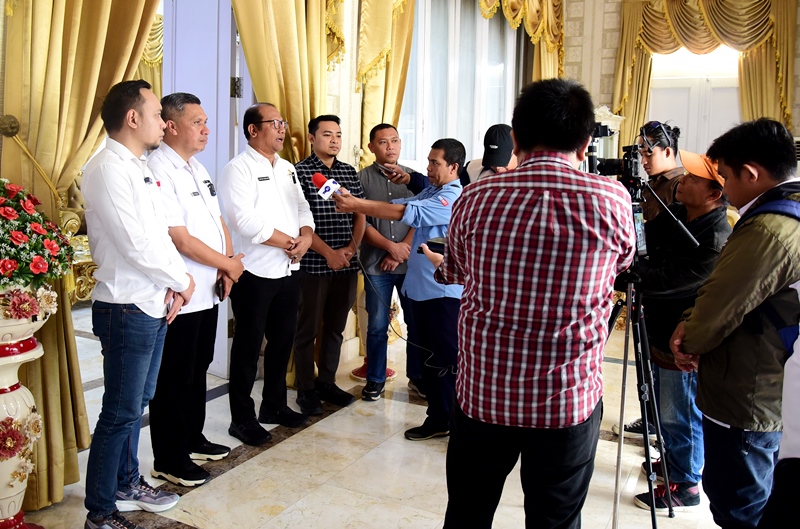 Sekdaprov Gorontalo Sopian Ibrahim didampingi oleh Kepala BKD dan Tim Komunikasi Gubernur memberikan keterangan pers terkait penonaktifan Kepala Dinas Pemuda dan Olahraga di rumah jabatan Gubernur Gorontalo, Rabu (26/11/2025). (Foto : Haris)
