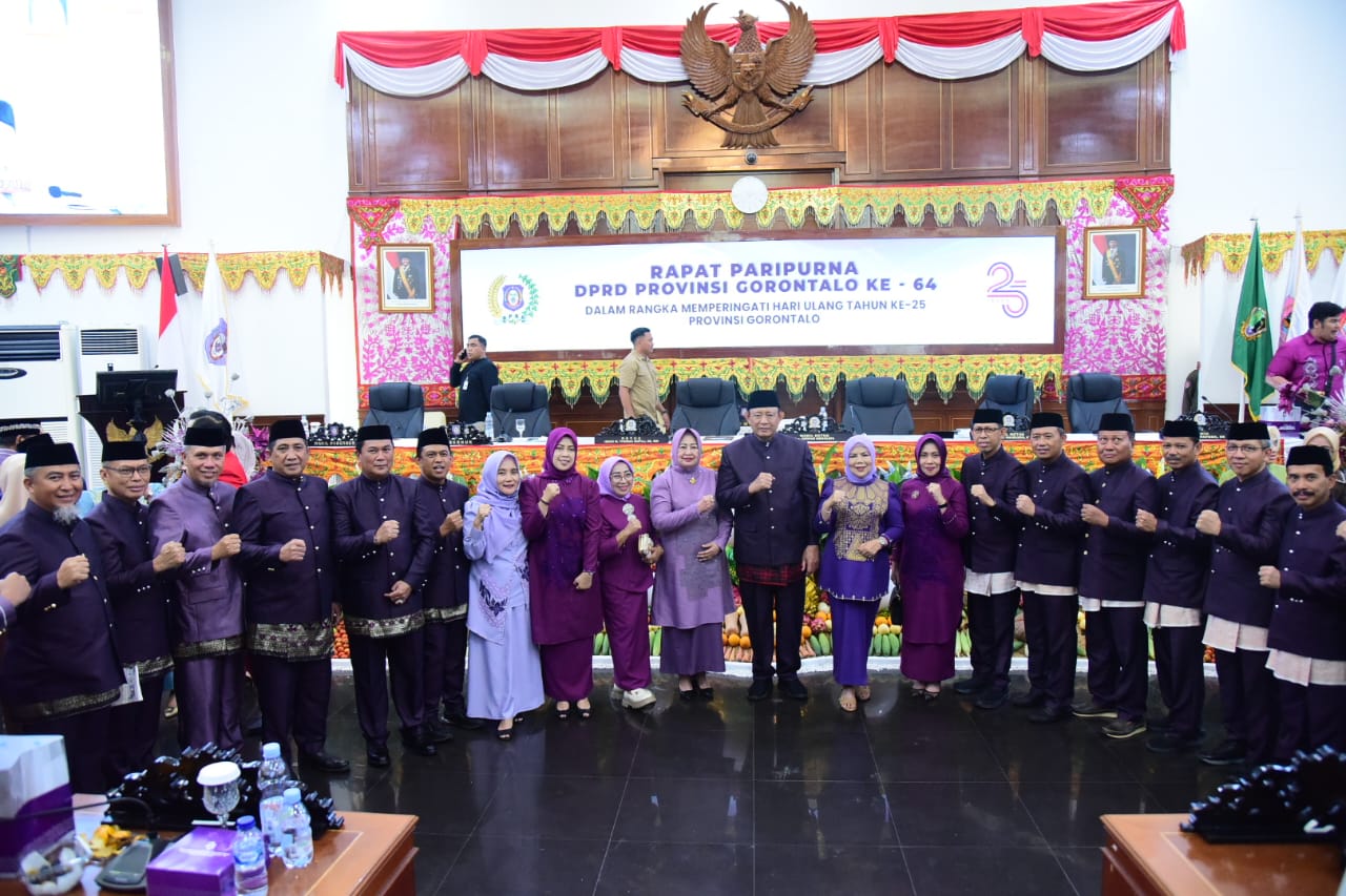 Paripurna HUT ke-25 Provinsi Gorontalo turut diwarnai nuansa adat dan kemeriahan tradisi lokal. Gubernur Gusnar Ismail bersama Wakil Gubernur Idah Syahidah tampil mengenakan pakaian adat Galenggo berwarna ungu, selaras dengan seluruh pimpinan OPD di lingkungan Pemerintah Provinsi Gorontalo yang juga mengenakan busana adat tersebut.