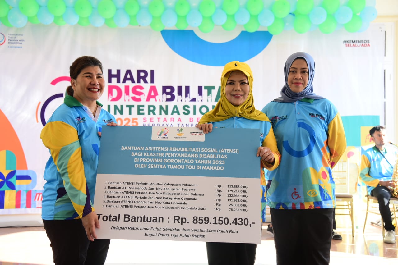 Kota Gorontalo, Kominfotik – Pemerintah Provinsi Gorontalo menerima Bantuan Asistensi Rehabilitasi Sosial (ATENSI) dari Kementerian Sosial RI melalui Sentra Tumou Tou Manado pada peringatan Hari Disabilitas Internasional (HDI), Minggu (6/12/2025). Bantuan diserahkan secara simbolis oleh Kepala Sentra Tumou Tou Manado Meerada Saryati Aryani, kepada Wakil Gubernur Gorontalo Idah Syahidah Rusli Habibie, disaksikan Kepala Dinas Sosial Provinsi Gorontalo Sagita Wartabone.