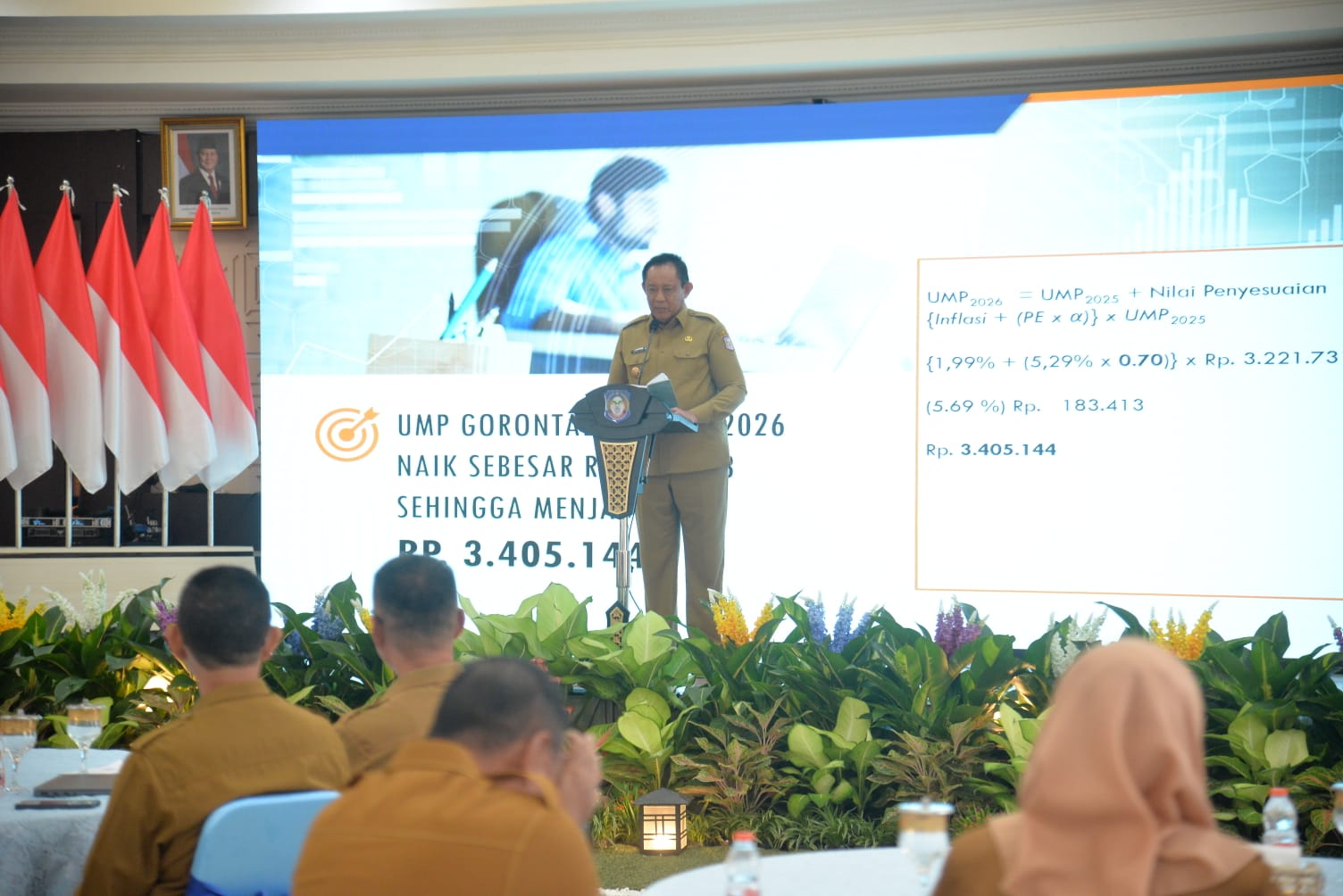 “Kami menetapkan UMP Tahun 2026 berada pada angka Rp3.405.144, bila dibandingkan dengan UMP tahun 2025, maka terdapat kenaikan kurang lebih Rp183.413 atau naik 5,7 persen, sehingga angka UMP ini berada diatas kebutuhan hidup layak masyarakat Provinsi Gorontalo” kata Gusnar.