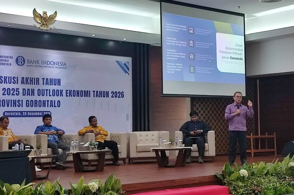 KOTA GORONTALO, Kominfotik – Sebagai bagian dari cerminan kinerja khususnya di sektor ekonomi, Pemerintah Provinsi Gorontalo menggelar agenda Diskusi Akhir Tahun – Refleksi Ekonomi 2025 dan Outlook ekonomi 2026 bertempat di Aula Kantor Bank Indonesia Perwakilan Gorontalo, Senin (29/12/2025). Salah satu yang menarik dalam bahasan agenda ini, adalah paparan Tim Peneliti Kajian Aglomerasi Kota Gorontalo Prof. Syarwani Canon.