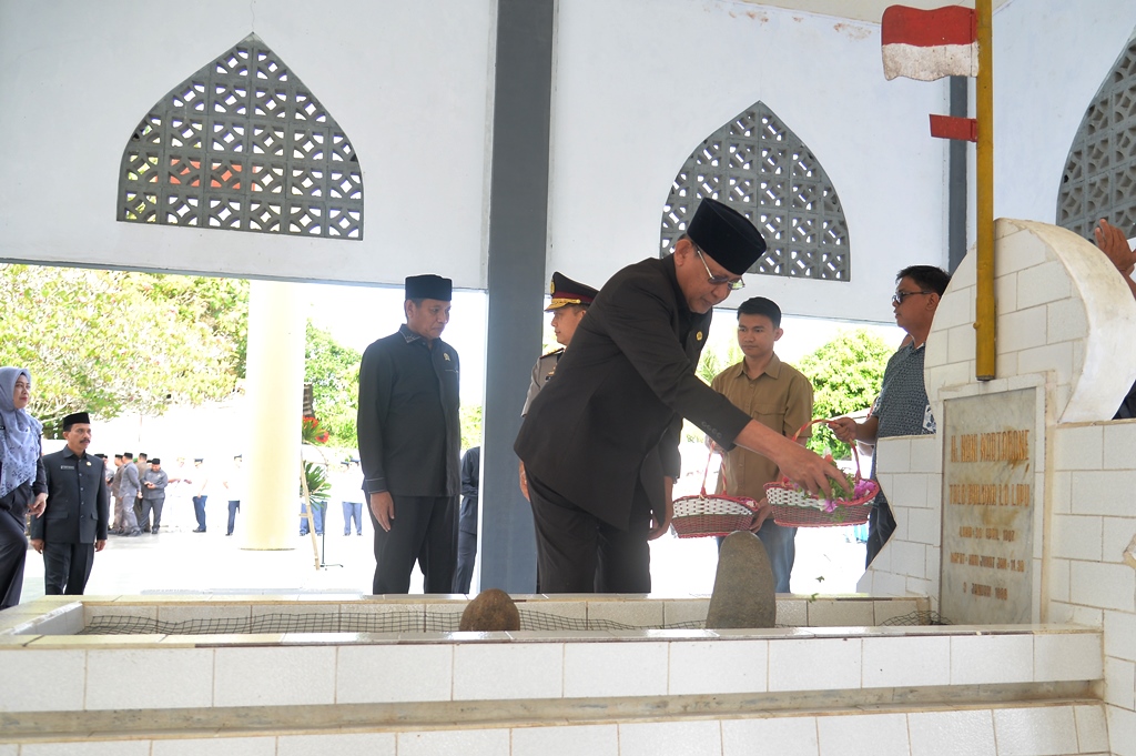 Gubernur Gorontalo Gusnar Ismail menabur bunga di Makam Pahlawan Nasional Nani Wartabone di Kecamatan Suwawa, Kabupaten Bone Bolango, Jumat (23/1/2026), dalam rangka peringatan Hari Patriotik 23 Januari 1942 ke-84. (Foto : Rian)