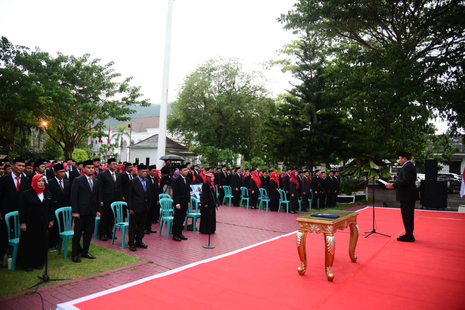 Gubernur Gorontalo Gusnar Ismail saat menyaksikan penandatanganan berita acara pelantikan pejabat administrator (Eselon III) dan pengawas (Eselon IV) yang berlangsung di halaman rumah jabatan Gubernur, Kamis (29/1/2026).  Foto – Nova Diskominfotik.