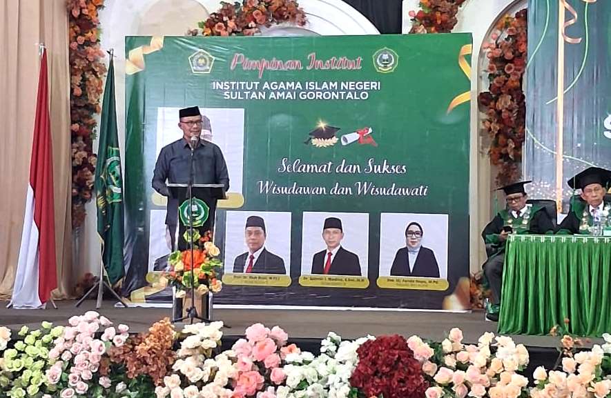 Kota Gorontalo, Kominfotik – Penguatan sumber daya manusia (SDM) yang berintegritas menjadi penekanan Staf Ahli Bidang Kemasyarakatan dan SDM Setda Provinsi Gorontalo Masran Rauf, saat mewakili Gubernur pada Wisuda Sarjana dan Magister Institut Agama Islam Negeri (IAIN) Sultan Amai Gorontalo di Sumber Ria Ballroom, Sabtu (14/2/2026). Kegiatan tersebut diikuti 413 wisudawan dan wisudawati serta dihadiri Kapuspenma Kementerian Agama RI, unsur Forkopimda, pimpinan perguruan tinggi, kepala kantor wilayah Kementerian Agama, dan perwakilan pemerintah daerah.