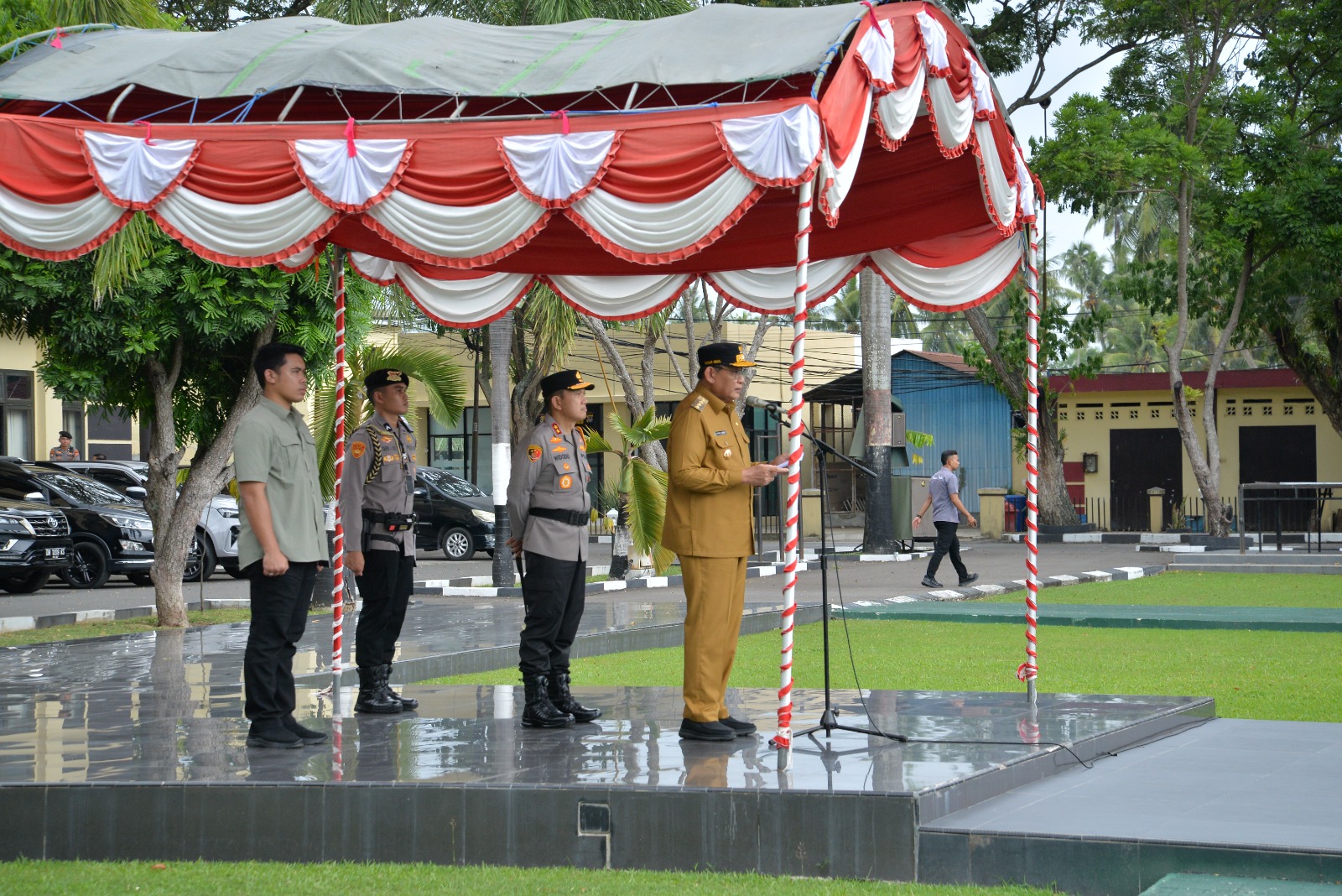 Gubernur Gorontalo Gusnar Ismail saat membacakan amanat Kapolri pada apel gelar pasukan operasi kepolisian terpusat Ketupat Otanaha 2026 di Lapangan Mapolda Gorontalo, Kamis (12/03/2026). (Foto : Mila)