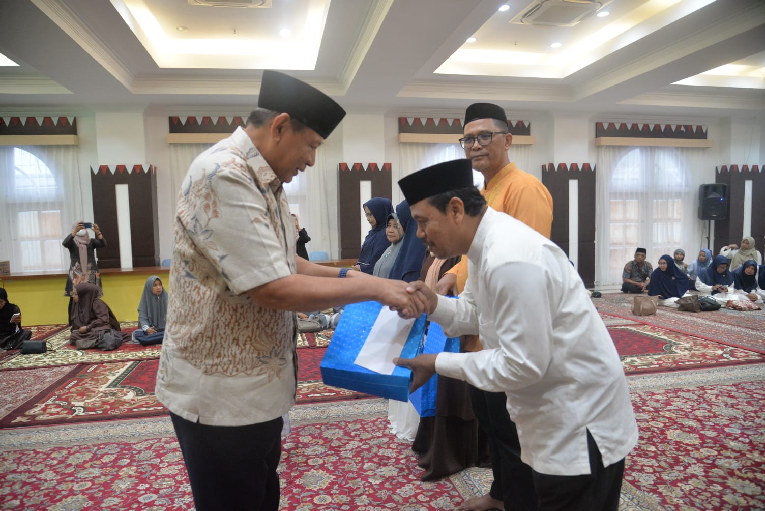 Gubernur Gorontalo Gusnar Ismail menyerahkan bingkisan kepada peserta tadarus sebagai bentuk apresiasi atas partisipasi selama bulan suci Ramadan 1447 Hijriah, Jumat (13/3/2026). Foto – Ryan Diskominfotik.