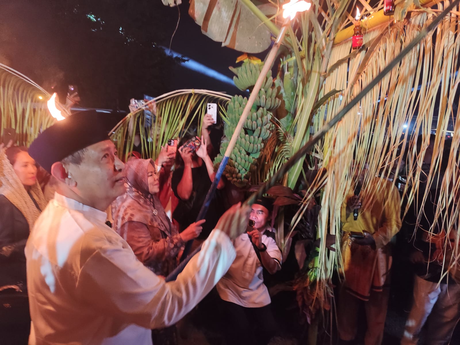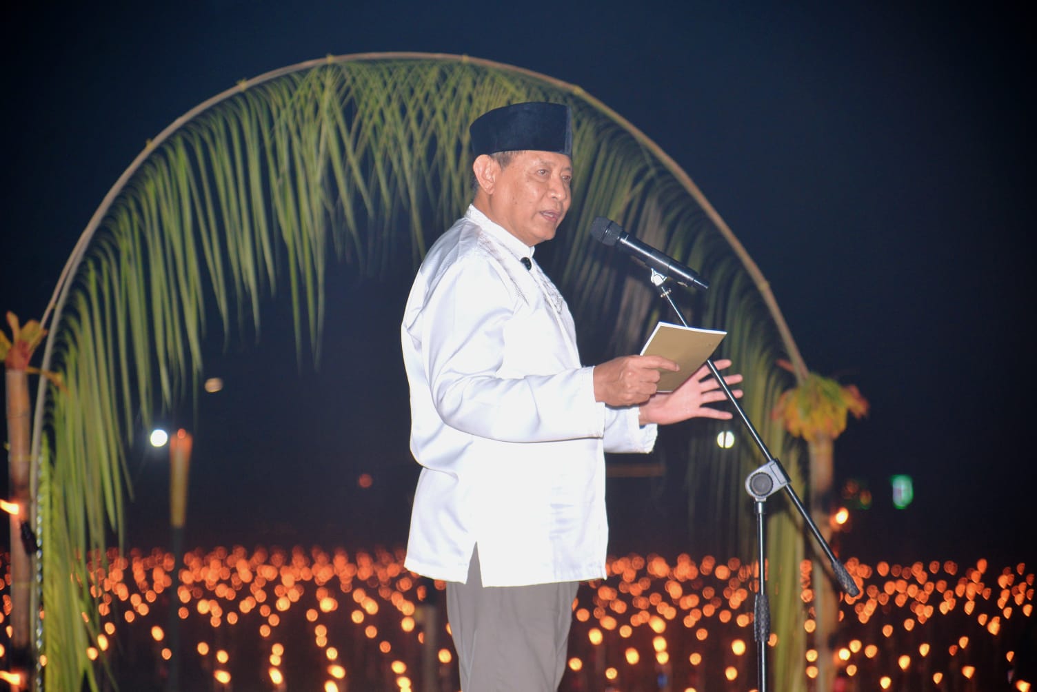 Dalam sambutannya, Gusnar menguraikan sejarah panjang Tumbilotohe yang bermula sejak masuknya ajaran Islam oleh Sultan Amai di tengah masyarakat animisme. Ia menjelaskan bahwa seiring waktu, Kerajaan Gorontalo bertransformasi menjadi kerajaan Islam yang kemudian melahirkan praktik penyalaan lampu sebagai bagian dari ibadah di akhir Ramadan.