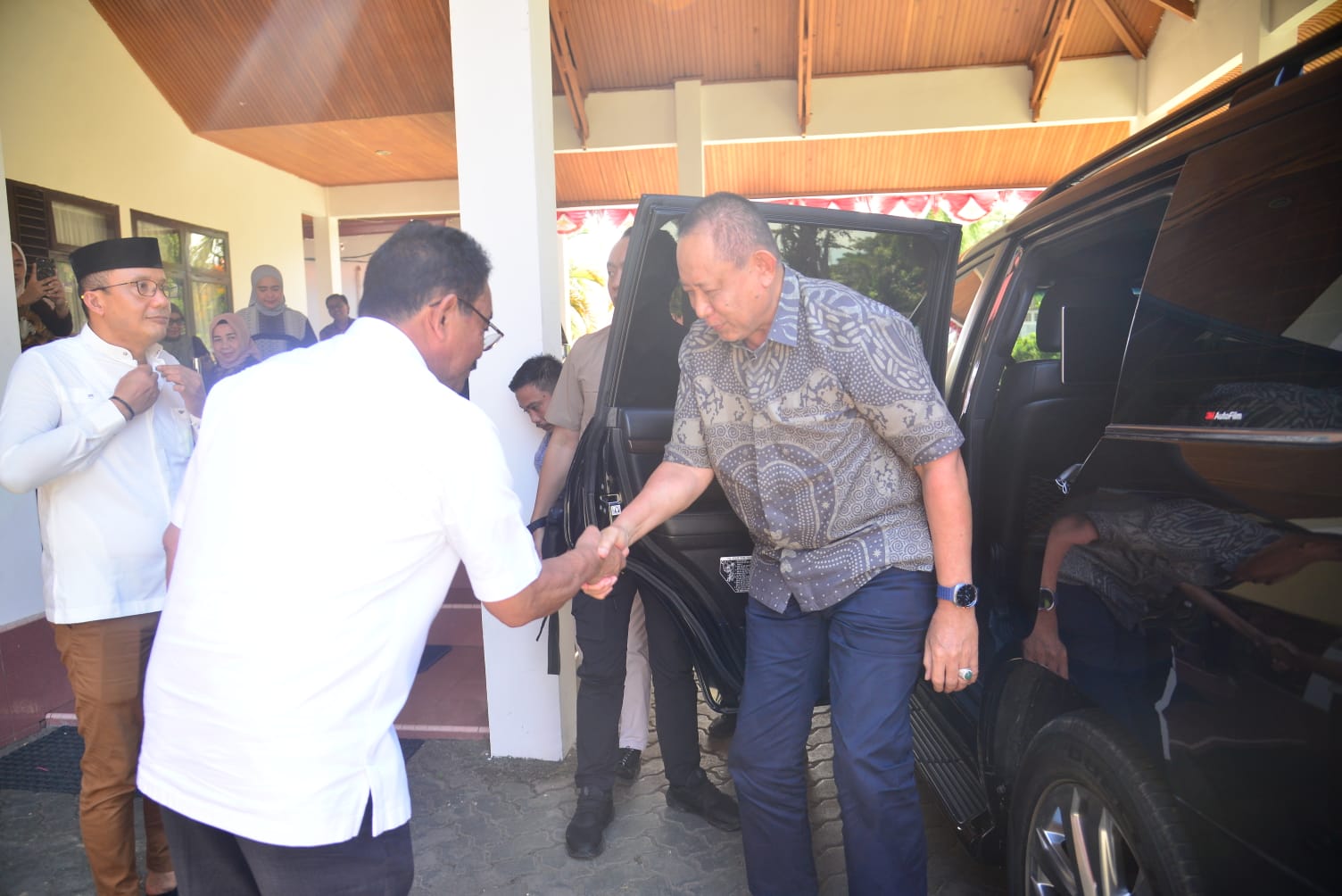 Gusnar bersama rombongan tiba di rumah jabatan Bupati Boalemo pada pukul 13.30 Wita. Kedatangannya disambut langsung oleh Bupati Boalemo Rum Pagau bersama Wakil Bupati Lahmuddin Hambali dan jajaran OPD Pemkab Boalemo.
