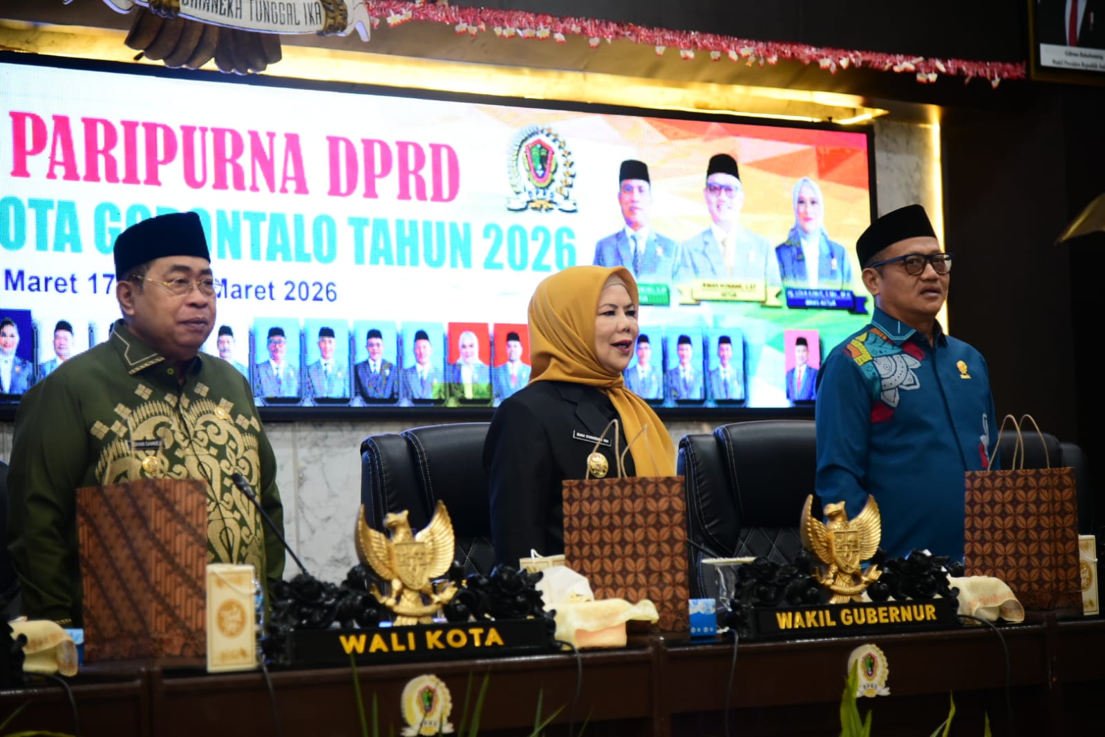 Paripurna HUT Kota Gorontalo turut dihadiri Wali Kota Adnan Dambea, Wakil Wali Kota Indra Gobel, ketua dan jajaran DPRD, instansi vertikal, serta pemangku kepentingan lainnya.