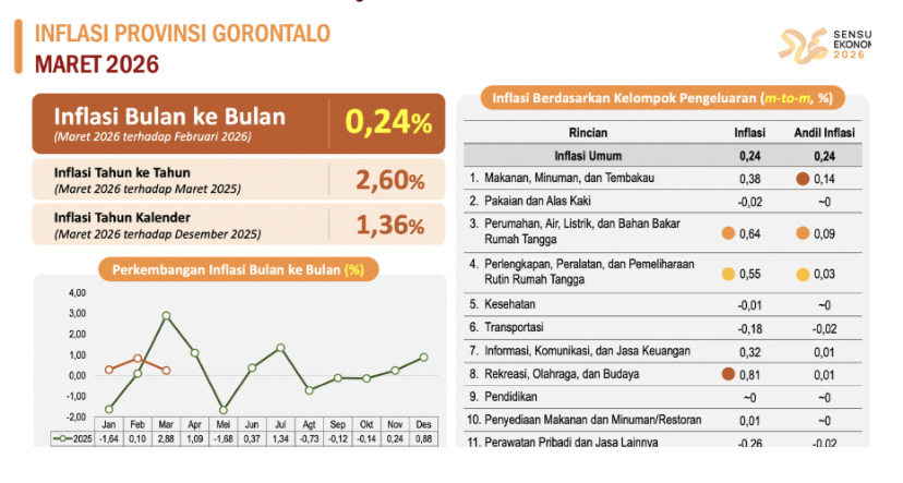 Kota Gorontalo, Kominfotik – Inflasi di Provinsi Gorontalo terkendali selama Ramadan 2026. Laporan Badan Pusat Statistik menyebut inflasi bulan Maret 2026 terhadap Februari 2026 tercatat terkendali di angka 0,24 persen meskipun permintaan masyarakat biasanya meningkat selama bulan Ramadan.