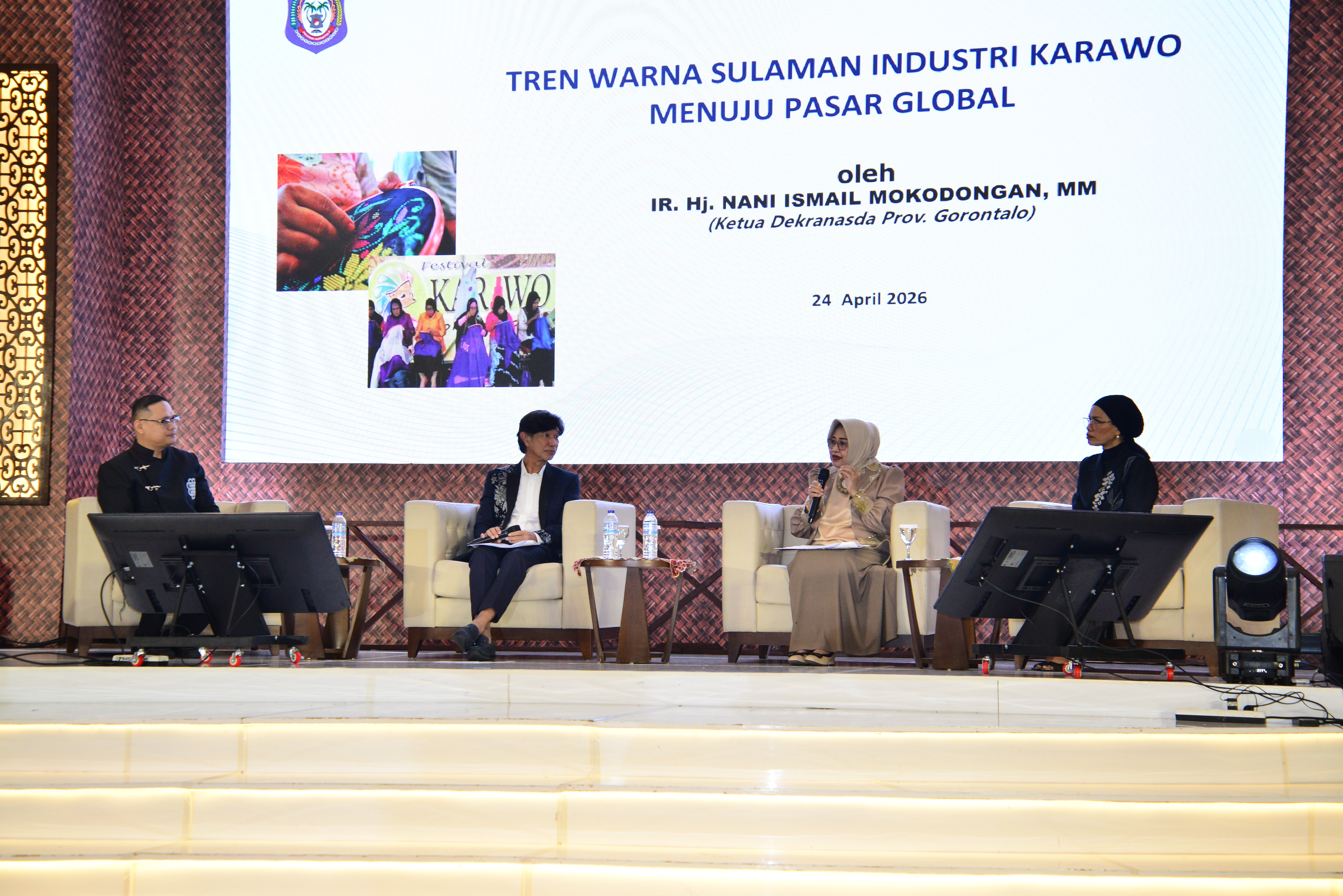 Kota Gorontalo, Kominfotik – Seminar Nasional Tren Warna Wastra Daerah Menuju Pasar Global dengan Prinsip Keberlanjutan yang digelar di Grand Palace Convention Center, Jumat (24/4/2026), mengangkat pentingnya strategi warna dan keberlanjutan dalam mendorong wastra Karawo menembus pasar internasional.